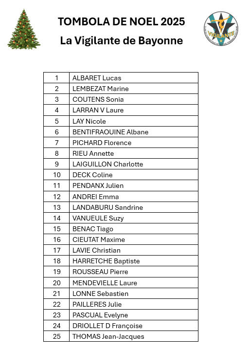 TOMBOLA DE NOËL 2025 14 décembre 2025 0 Par Celine Voici la liste des gagnants de la Tombola de Noël !! Les gagnants seront contactés par SMS afin de venir récupérer leur lot. Un grand merci à tous pour votre participation !!